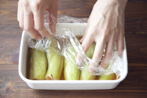 箸ではさんで少しやわらかくなったら、氷水にとって皮をむく。