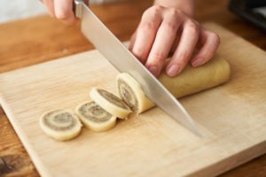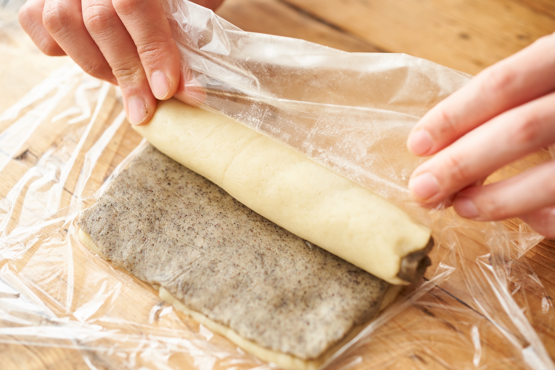 1の上に2をおいて縦長において手前から巻き、ラップで包んで冷蔵庫で30分冷やす。