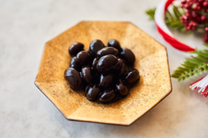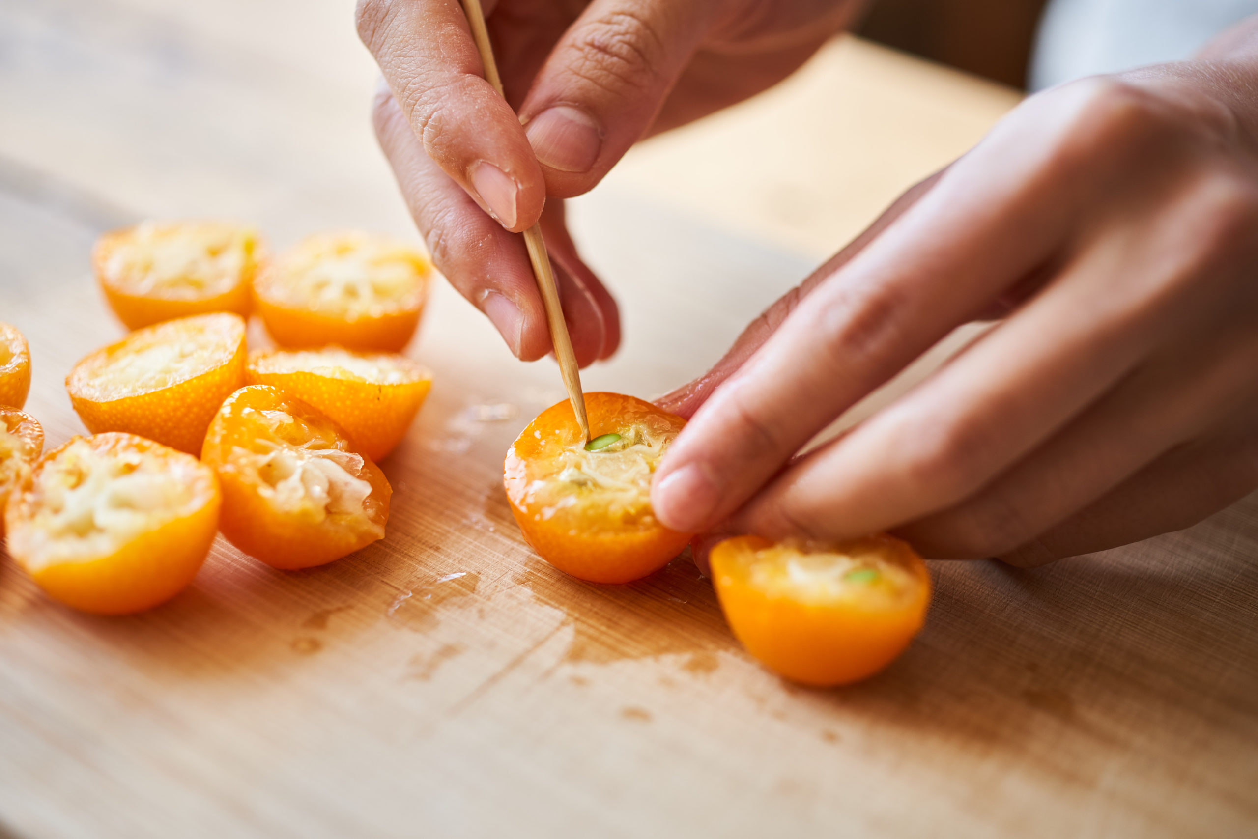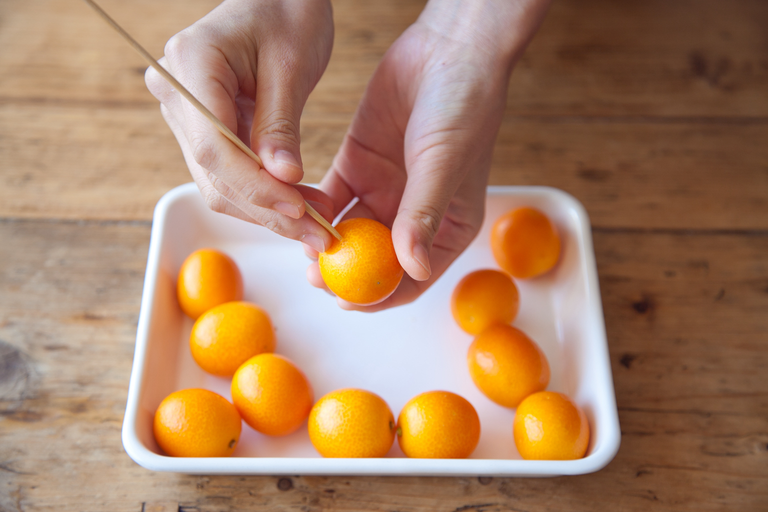 金柑のヘタを取り、横半分に切り、竹串で種を取り除く。