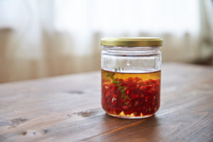 消毒をした清潔な瓶にざくろ、はちみつ、白ワインビネガー、