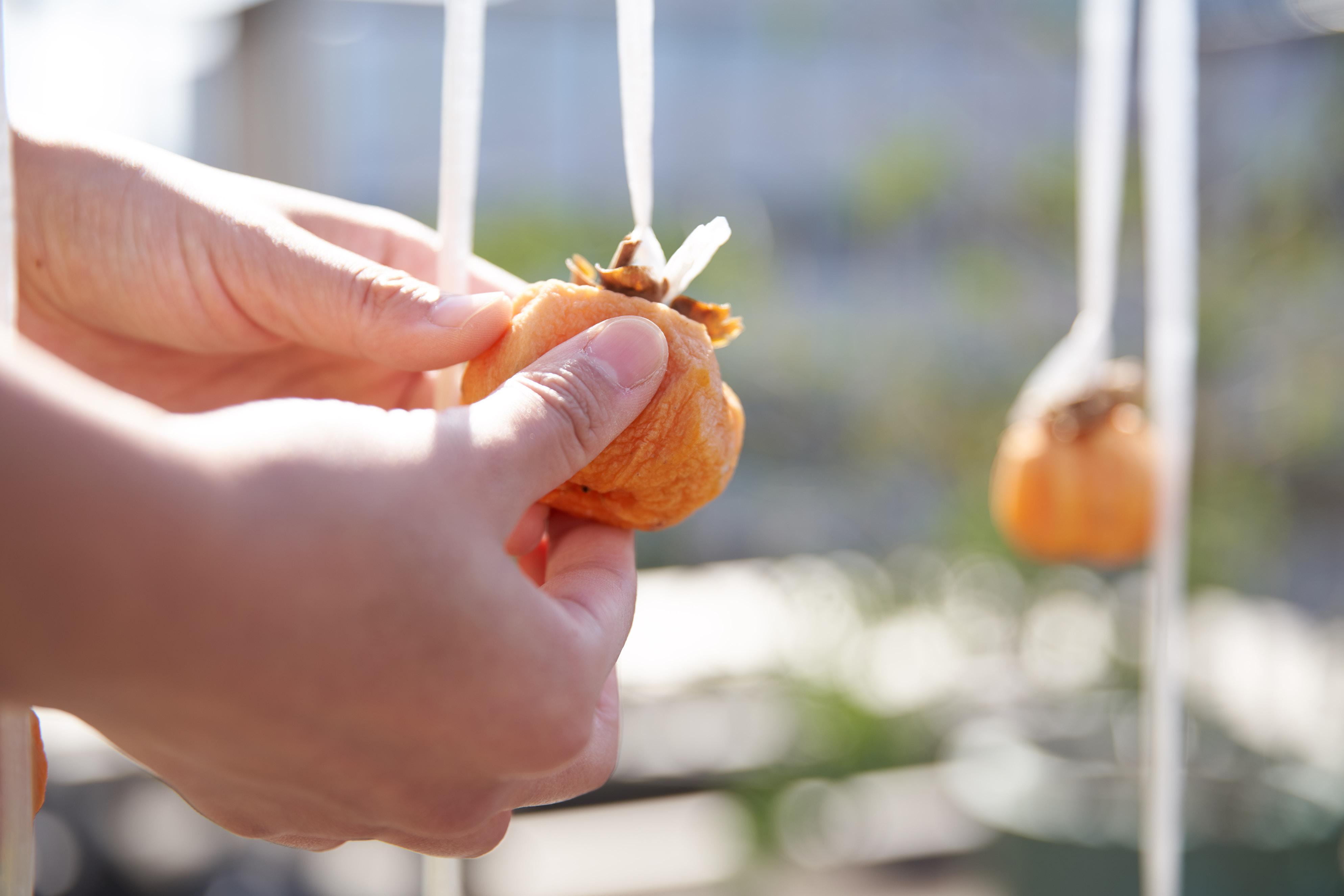 干し柿はカビが大敵です。水気には気をつけてなるべく風通しのよいところで干すようにしましょう。