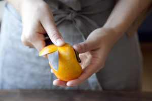 (おしりからヘタの方に向かって剥きます。なるべくヘタのきわまで皮を剥くようにします。)