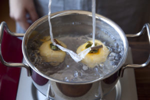 鍋に湯を沸騰させ、渋柿を5秒ずつ茹でる。