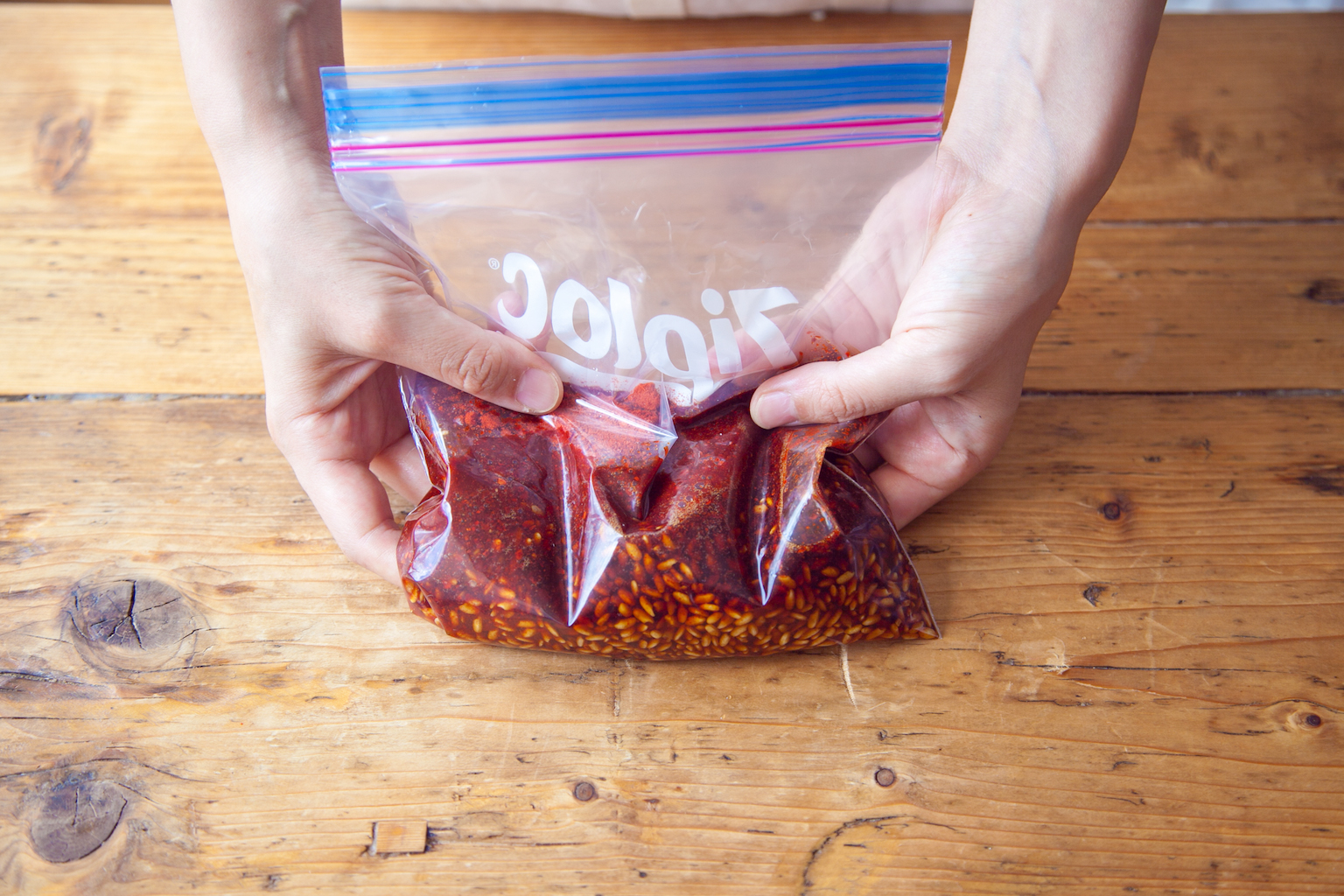 耐熱のジッパー付き保存袋に全ての材料をいれてなじませる。
