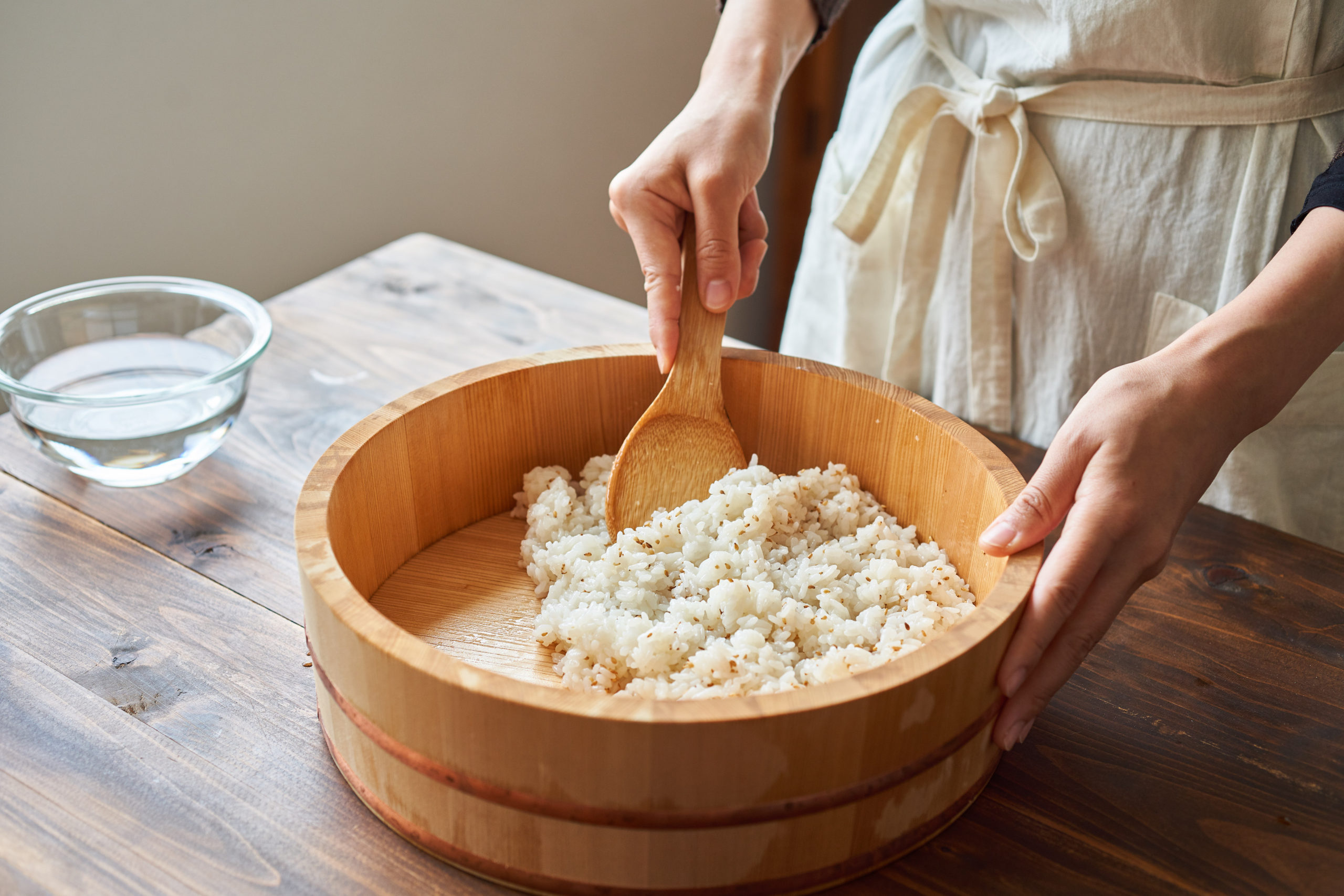 (B)を混ぜ合わせる。飯台(なければボウル)にごはんをいれ、