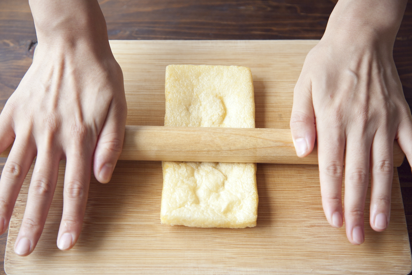 油揚げの上で麺棒などを転がし、袋に広げやすくする。