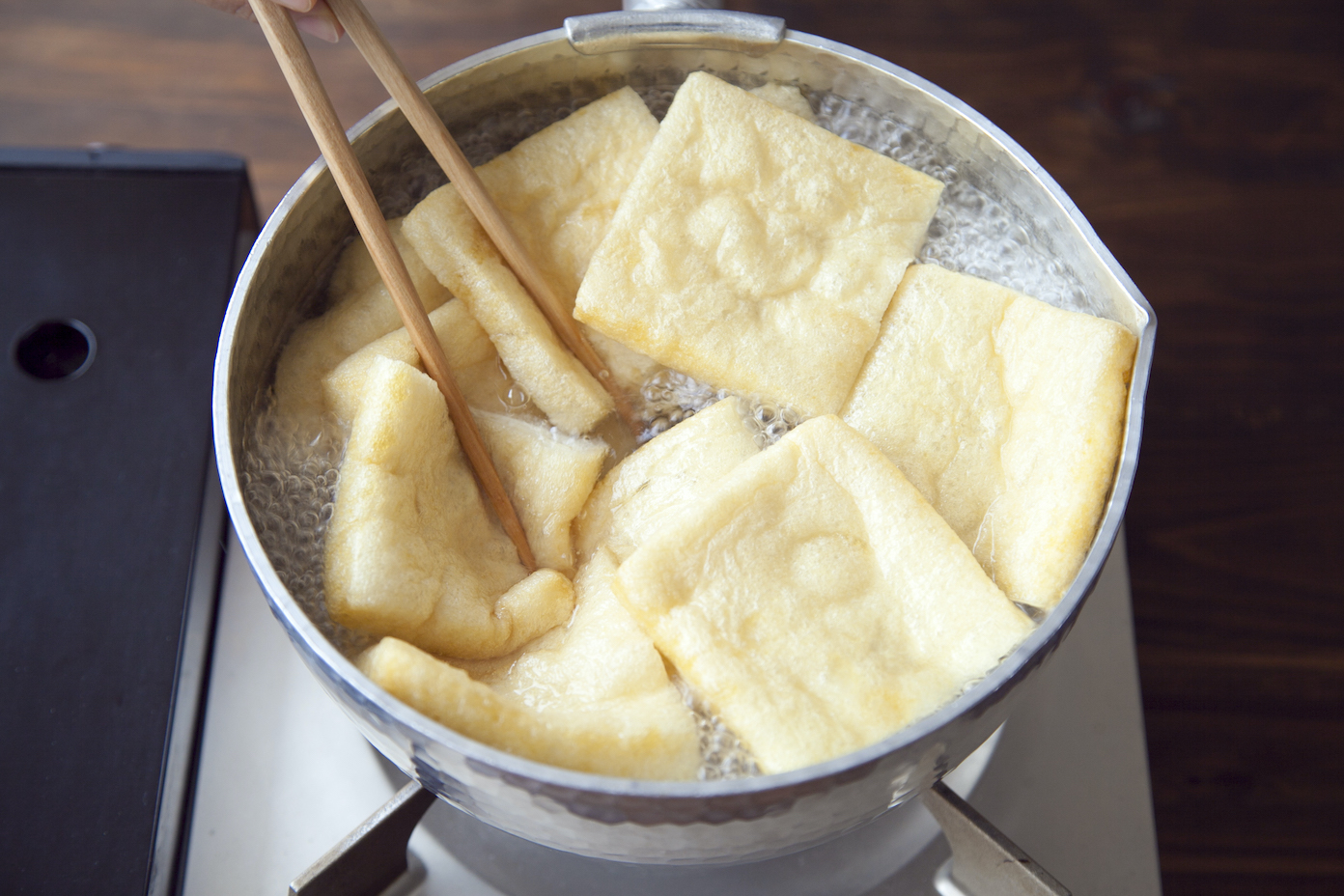 ザルにあげて、油揚げを両手で挟むようにして水を絞る。