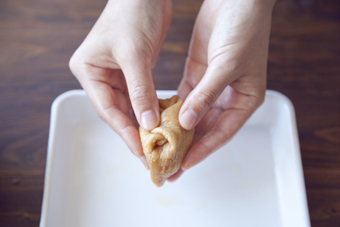 油揚げを両手で挟んで軽く汁気をしぼり、4のすし飯を1/10ずついれ、