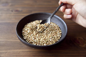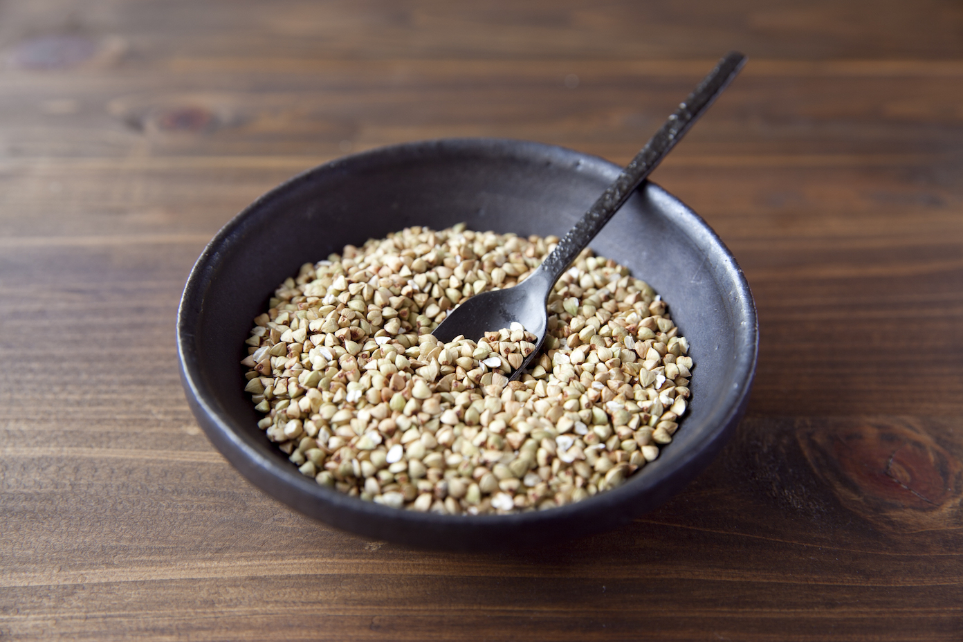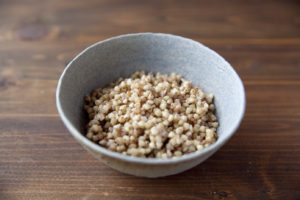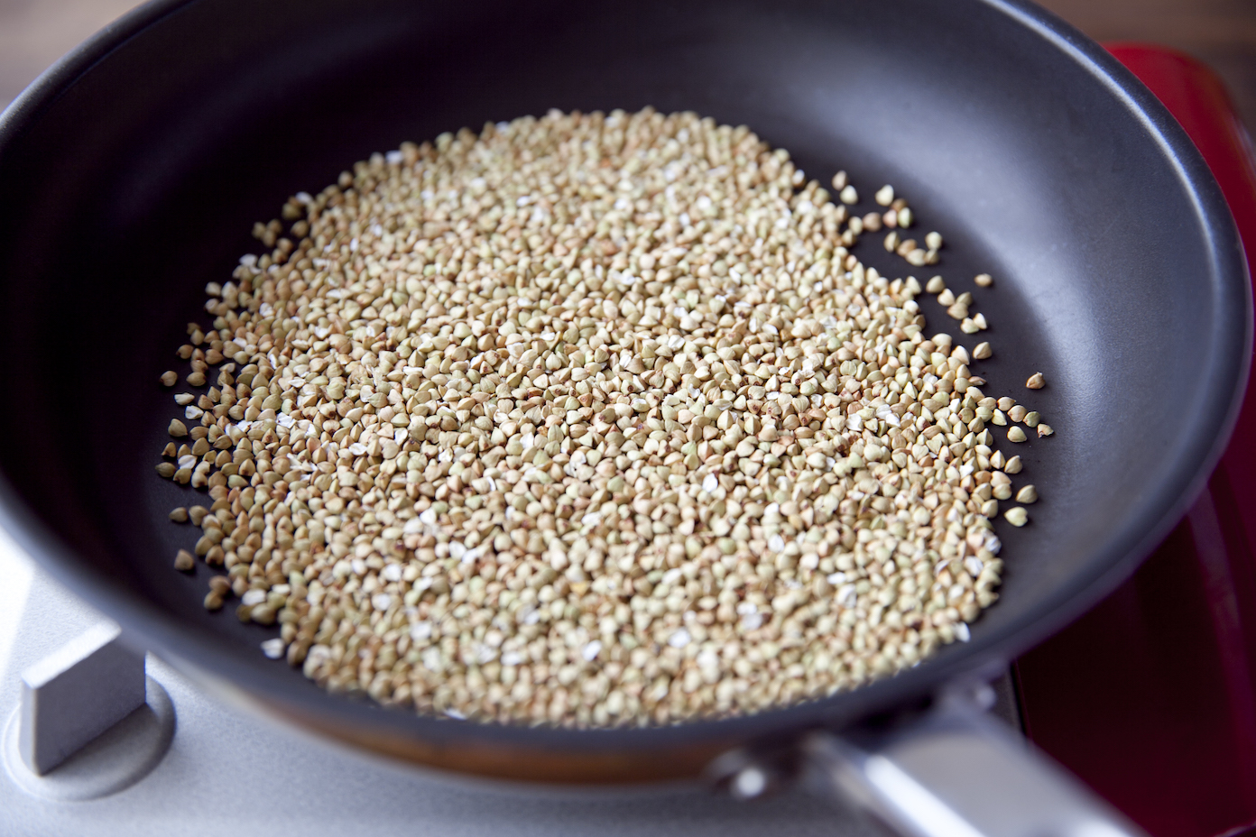 【1】フライパンを熱し、そばの実を入れて弱火にかけ、ゆすりながら炒る。