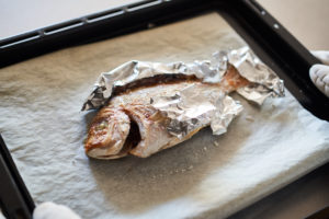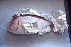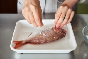 鯛の水気を拭き取り、オーブンの天板に鯛をのせ、塩を再びふる。