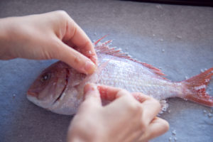 ・鯛は皮が破けるのを防ぐため、竹串で穴をあけます。