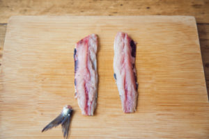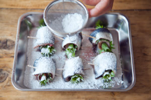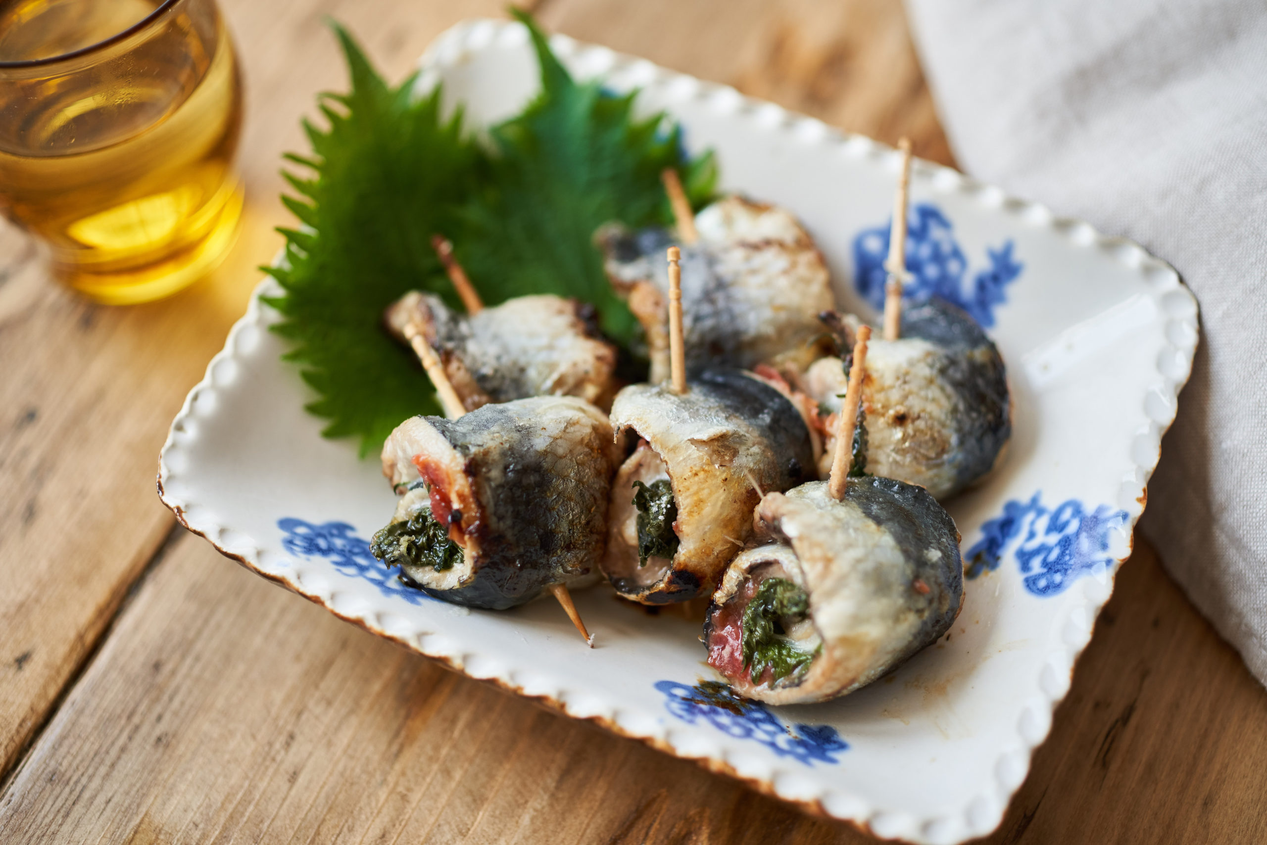 いわしに、(A)を塗り、青じそをのせて尾の方から巻き、
