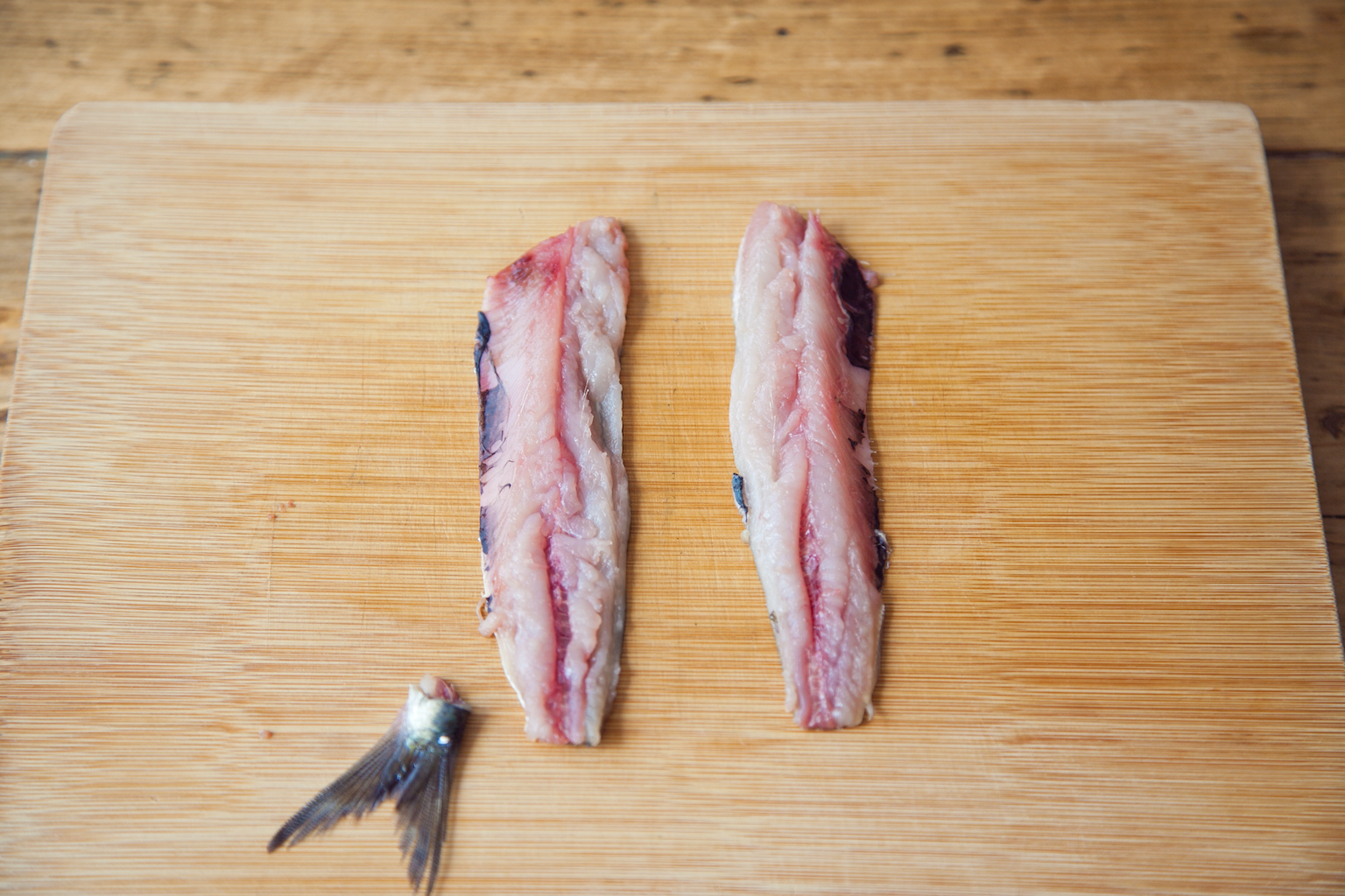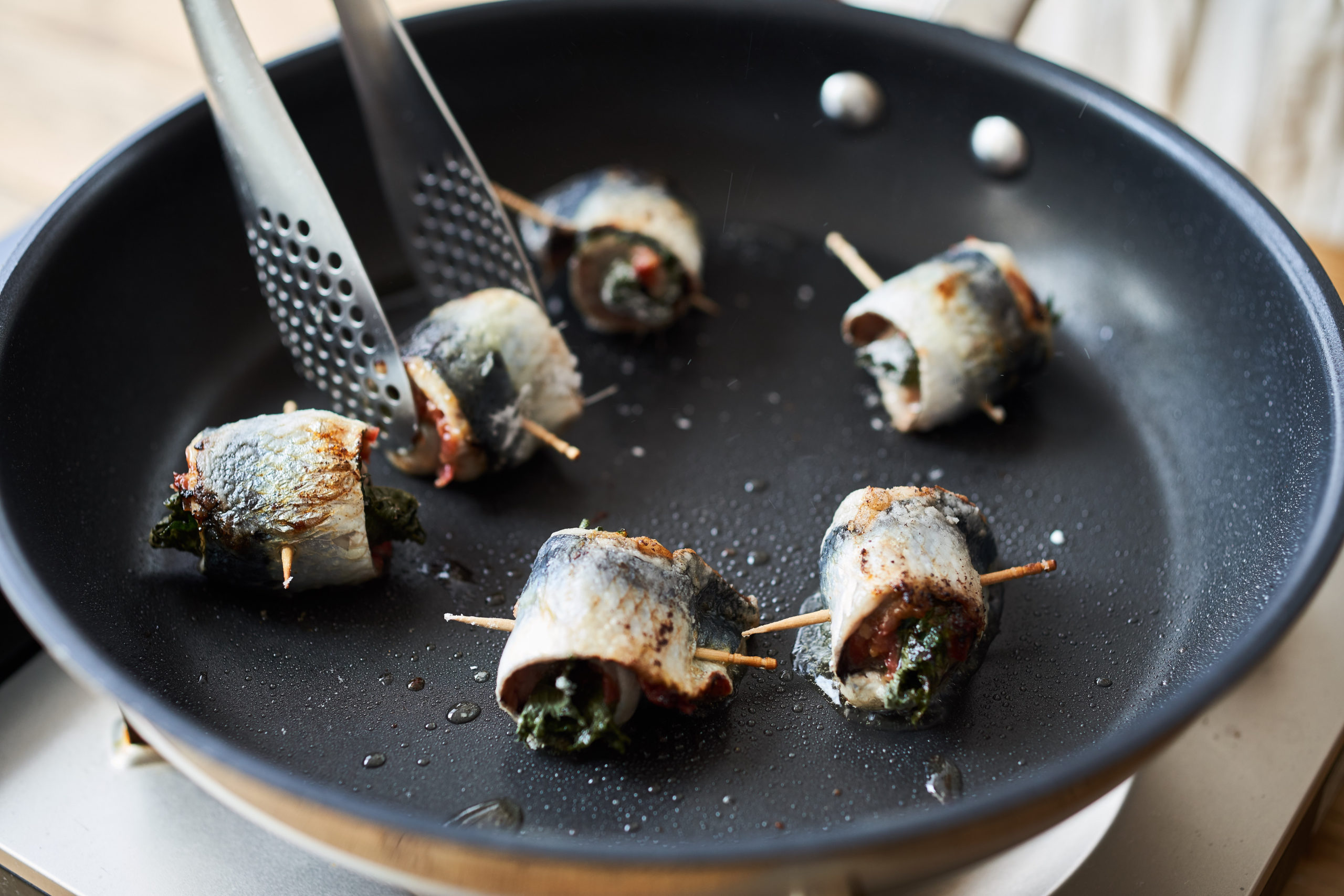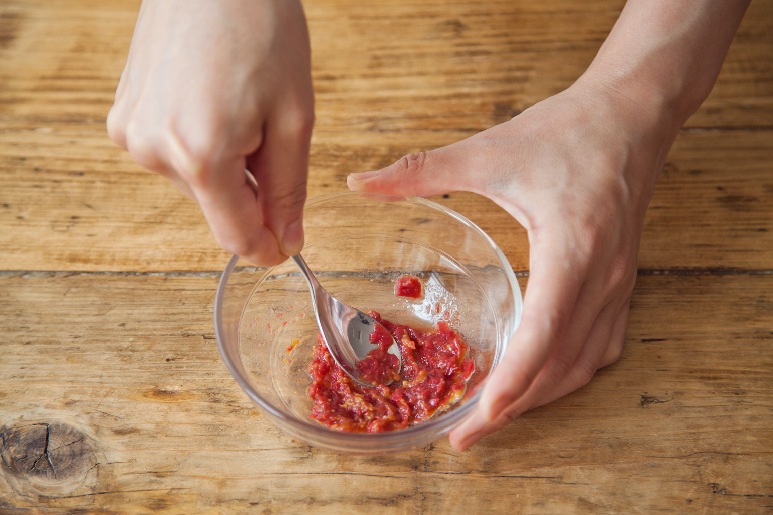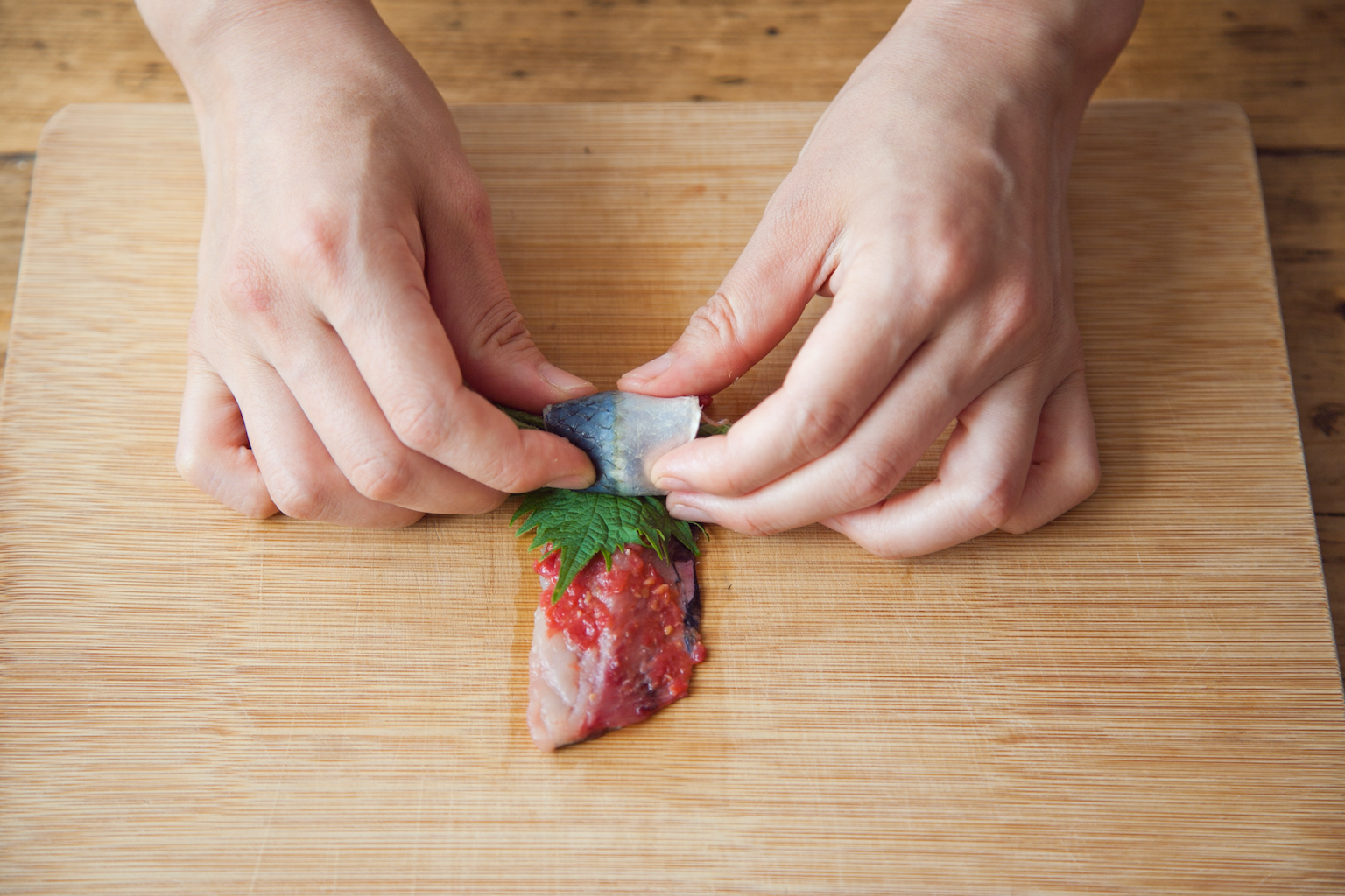 いわしに、(A)を塗り、青じそをのせて尾の方から巻き、
