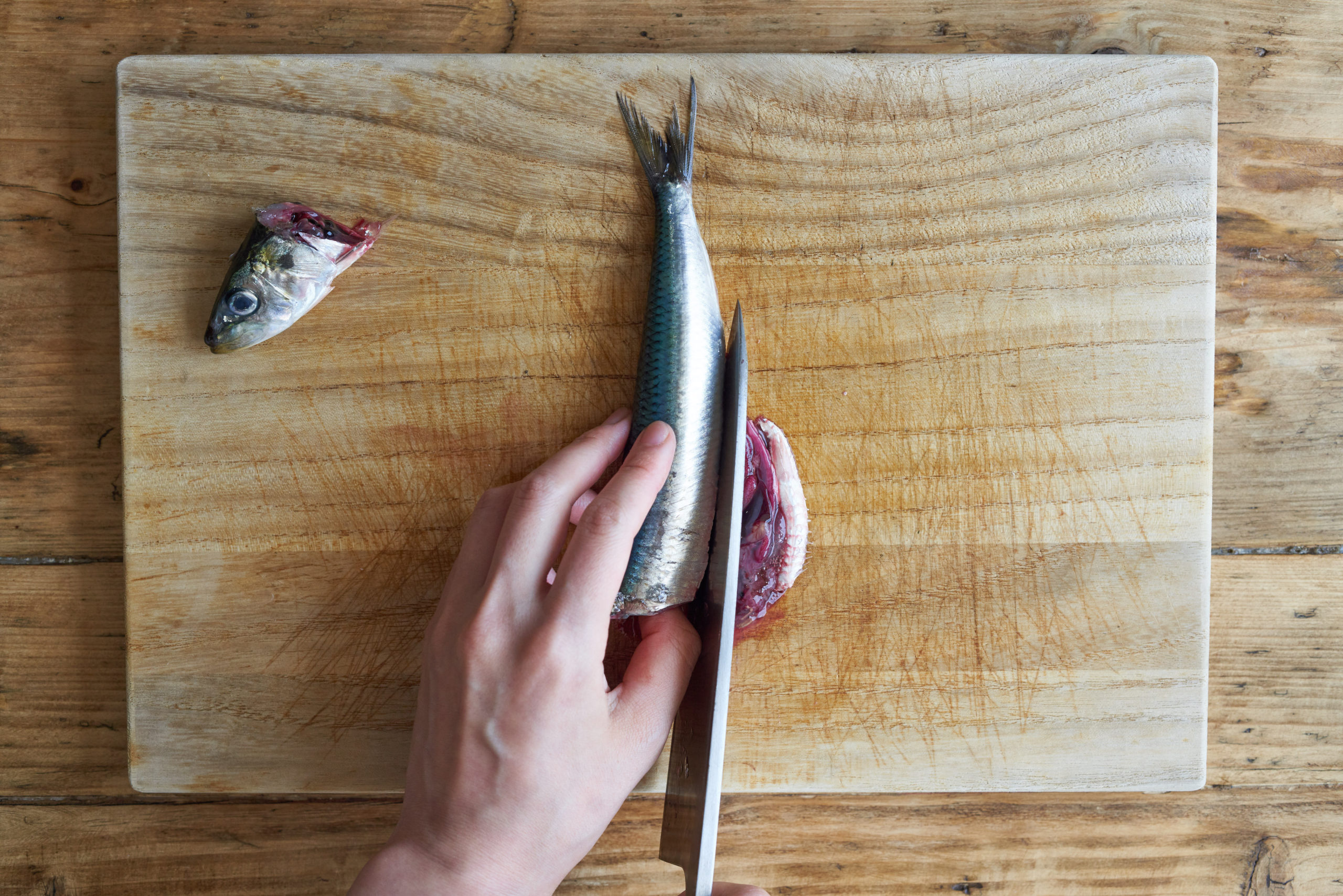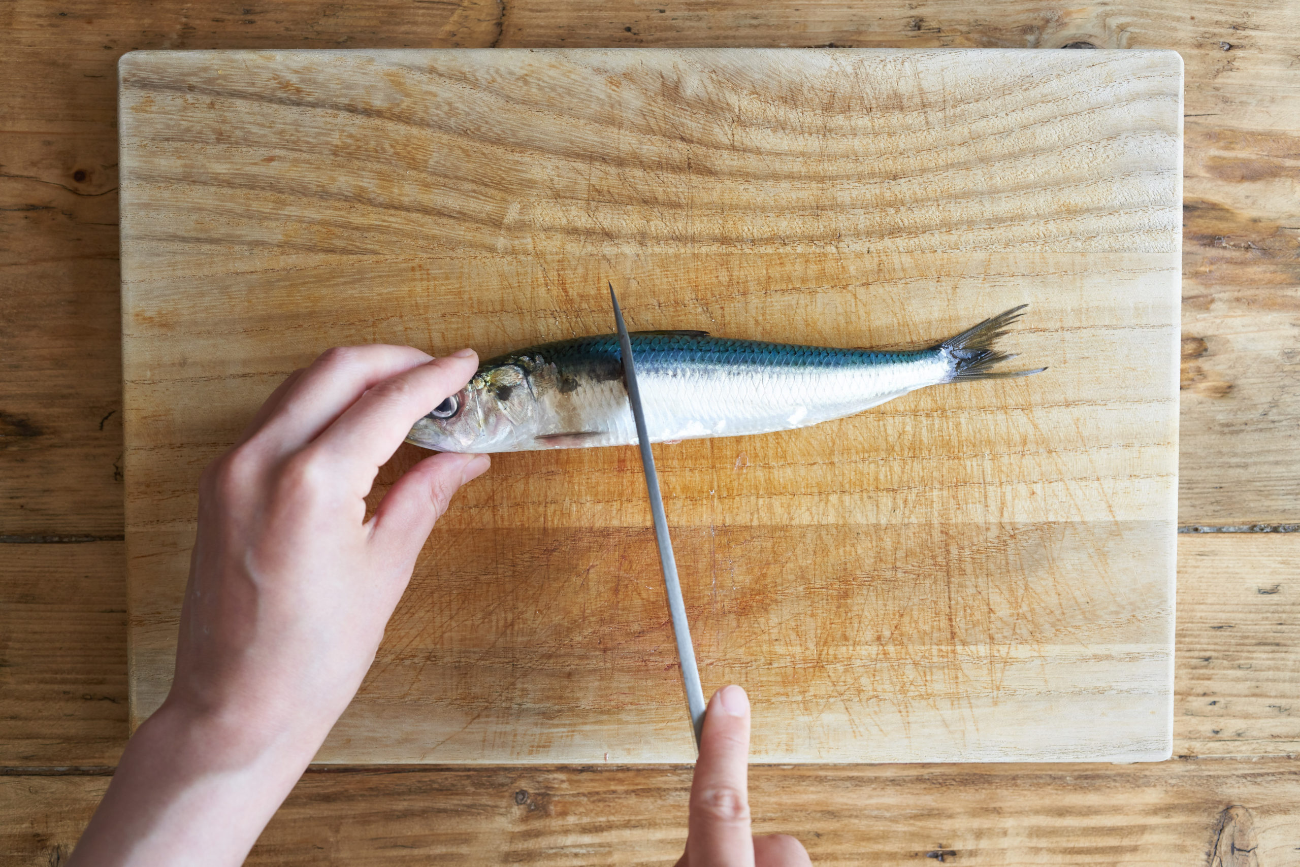 【4】ボウルに水を張り、いわしの外側、お腹の中を洗い、水気を拭き取る。