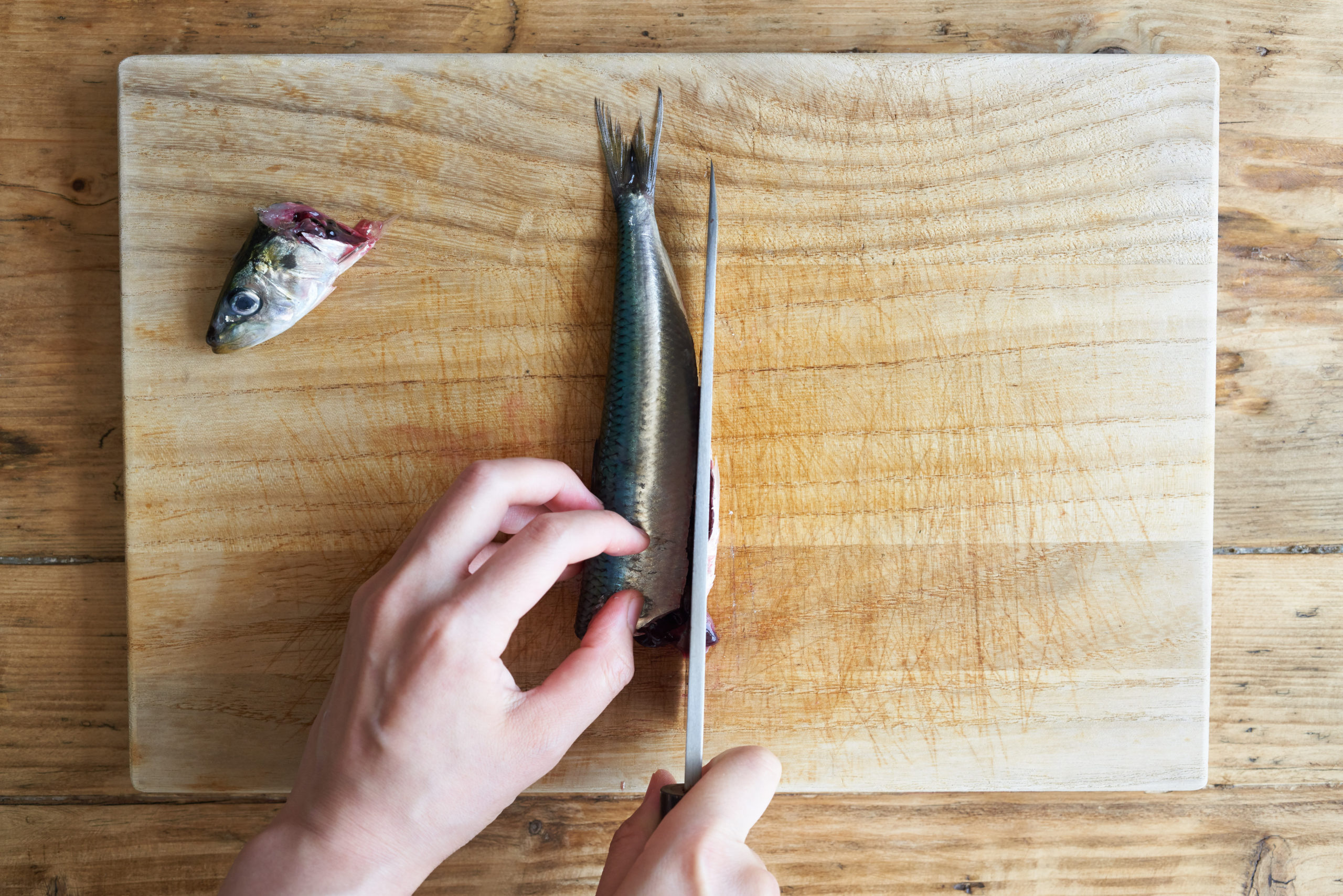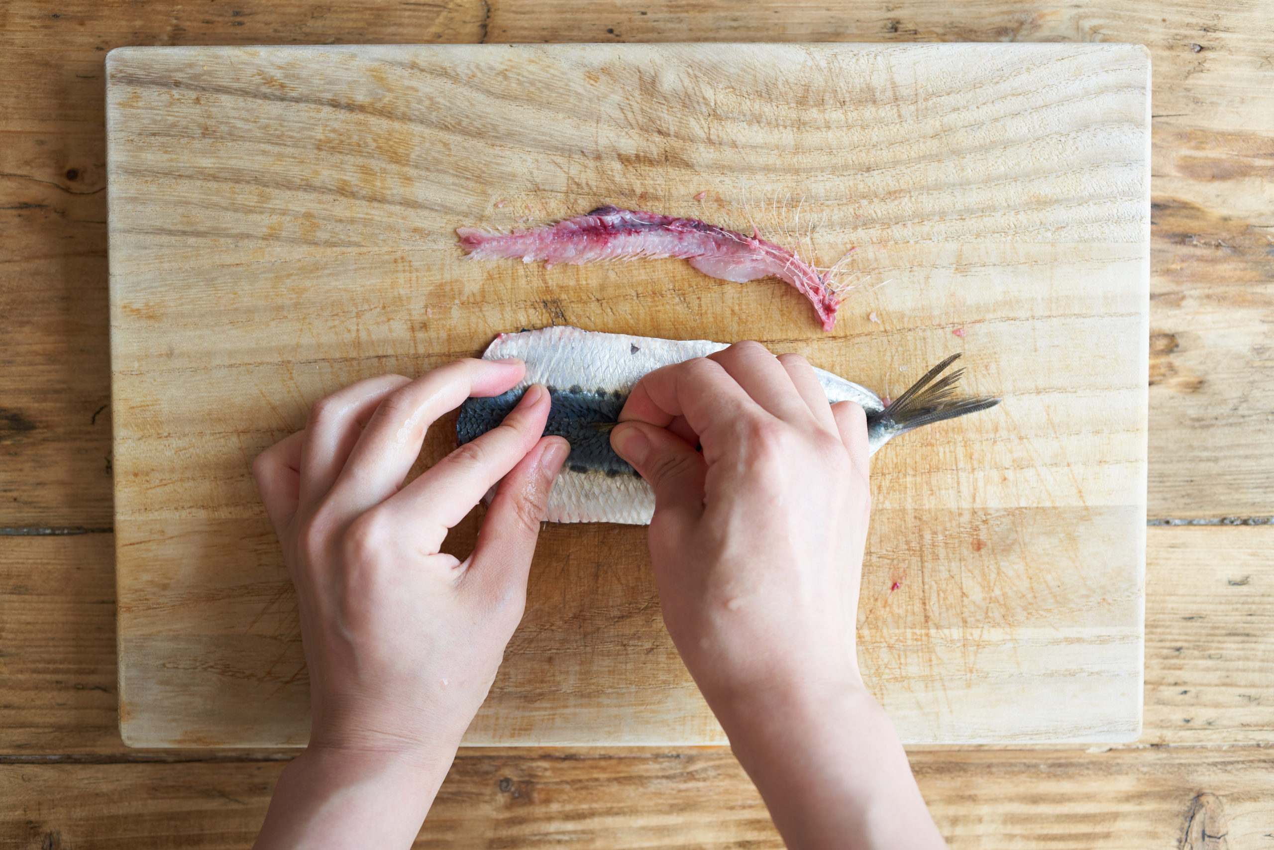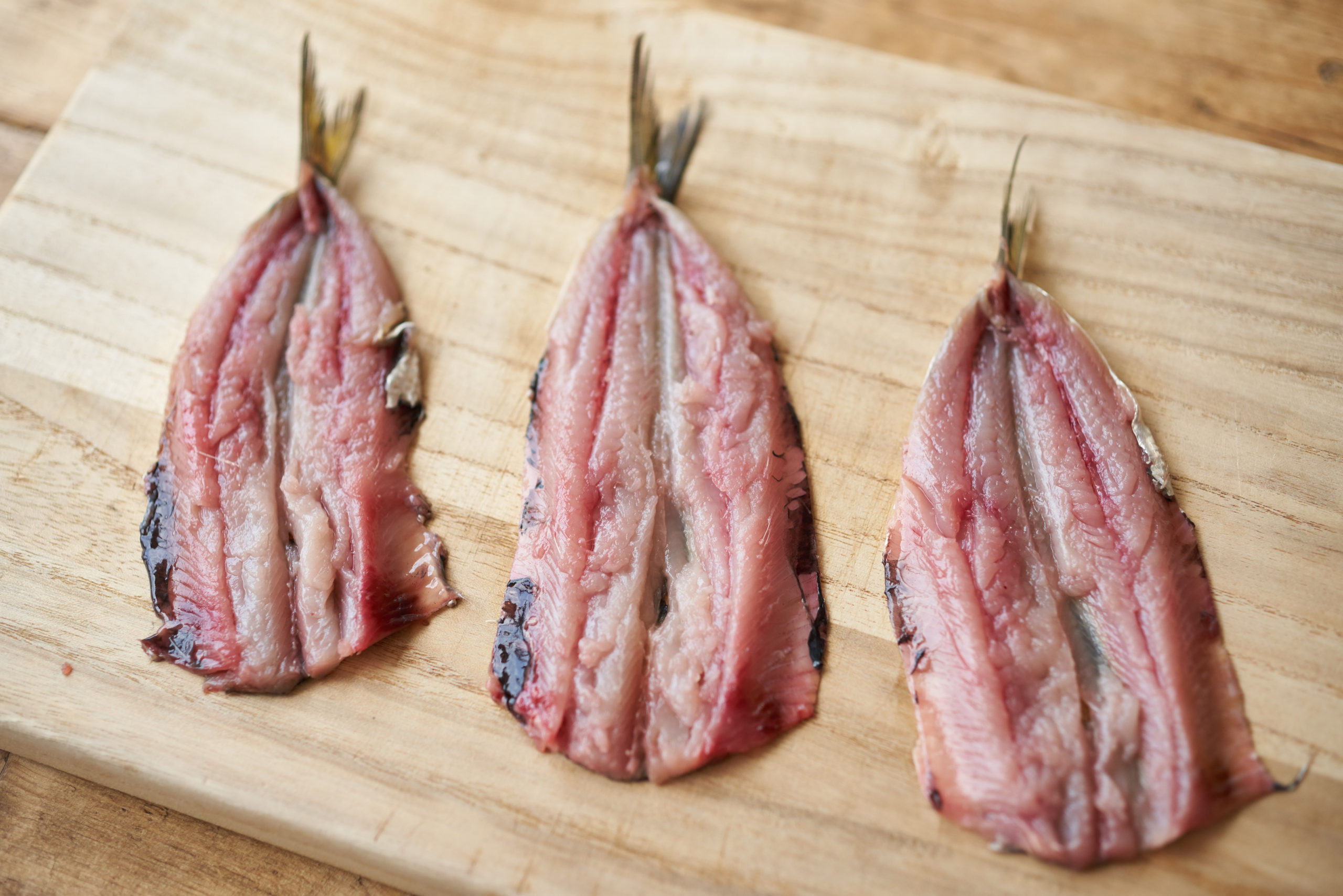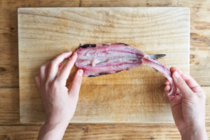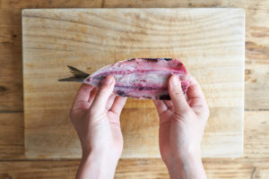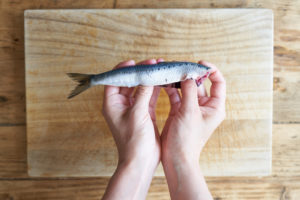 【5】いわしの中心、中骨の上に両手の親指を入れる。