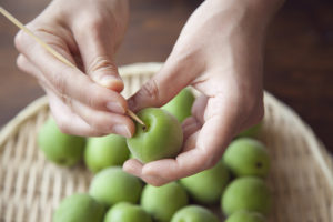 青梅は水洗いしてなり口のヘタをとり、一つずつ丁寧に水気を拭き取り、