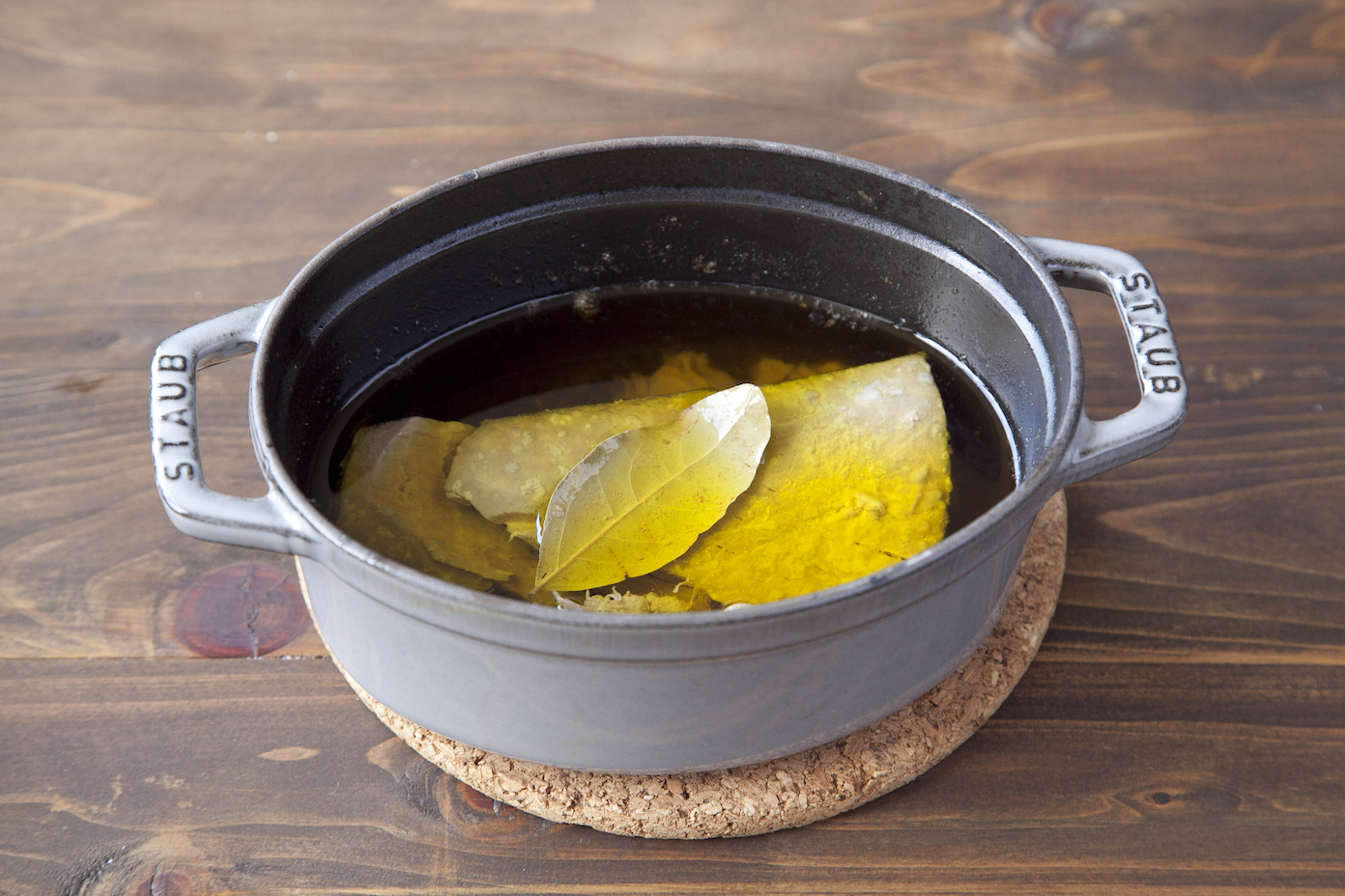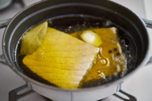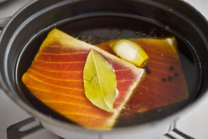 小さめの厚手の鍋に、水気を拭き取ったまぐろ、にんにく、ローリエ、黒胡椒を加え、