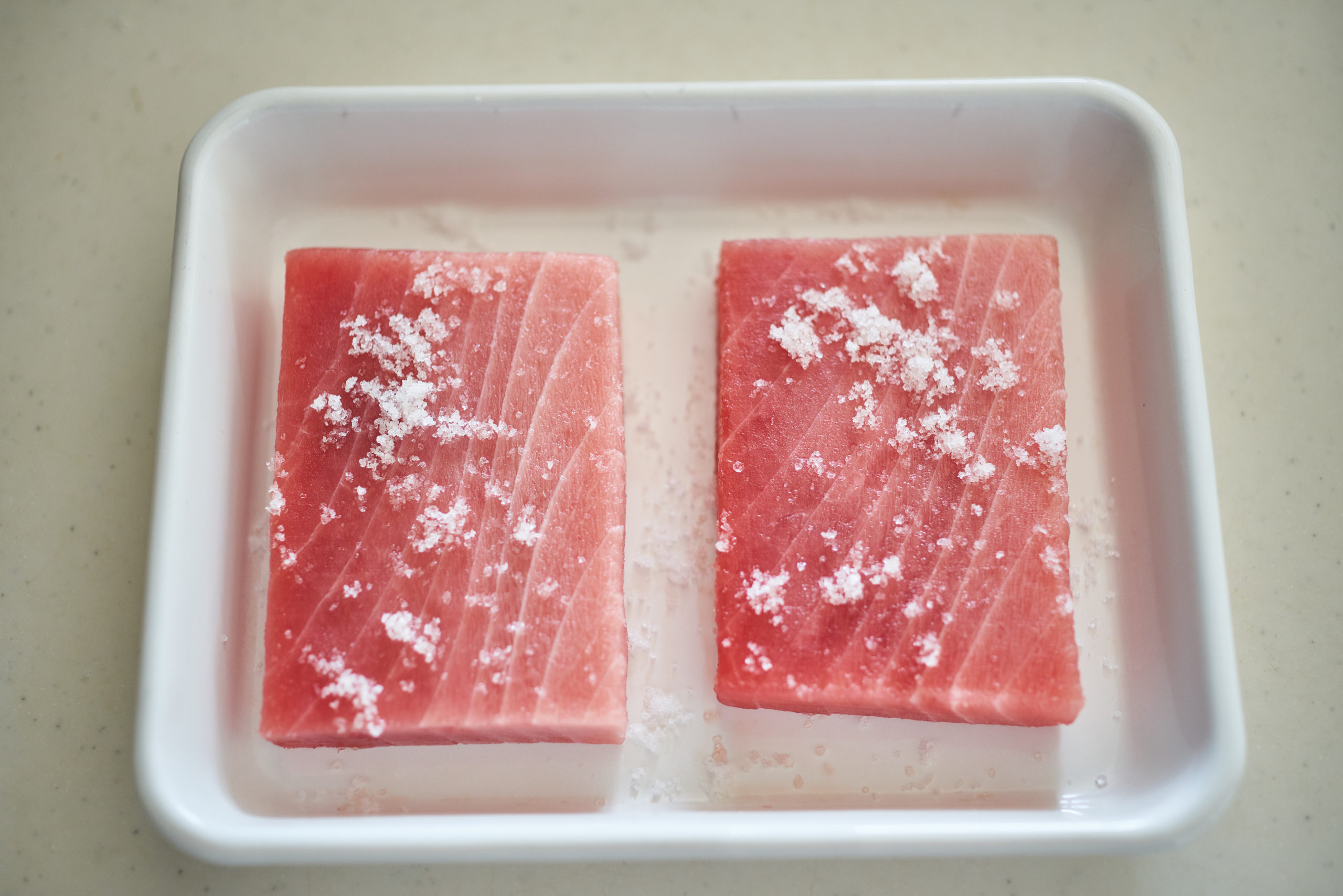 まぐろは半分の長さに切って全体に塩をふり、20分冷蔵庫においておく。