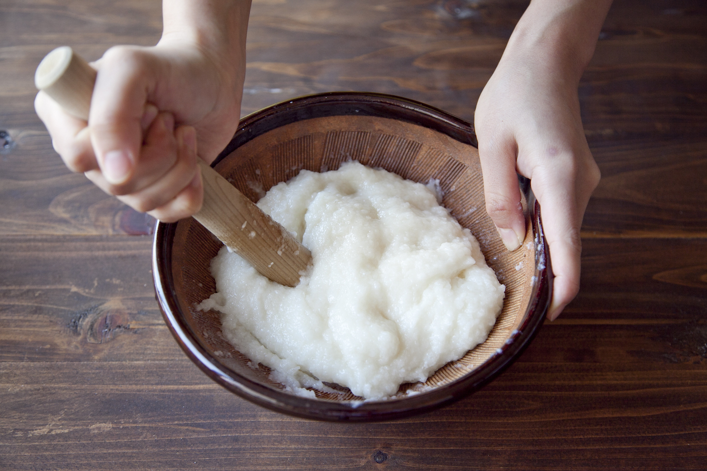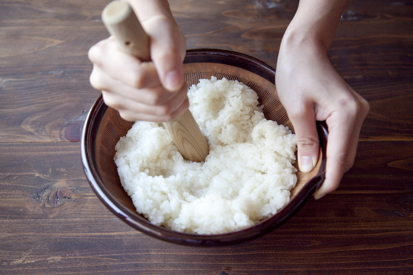 ごはんが炊けたらすり鉢に入れ、すりこぎで米粒がなくなるまでついて餅にする。