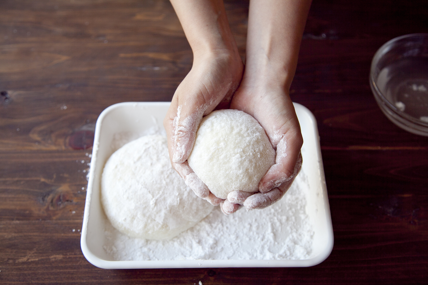 片栗粉を広げたバットに餅を入れ、手に水をつけて大小ふたつに分け、片栗粉をまぶす。