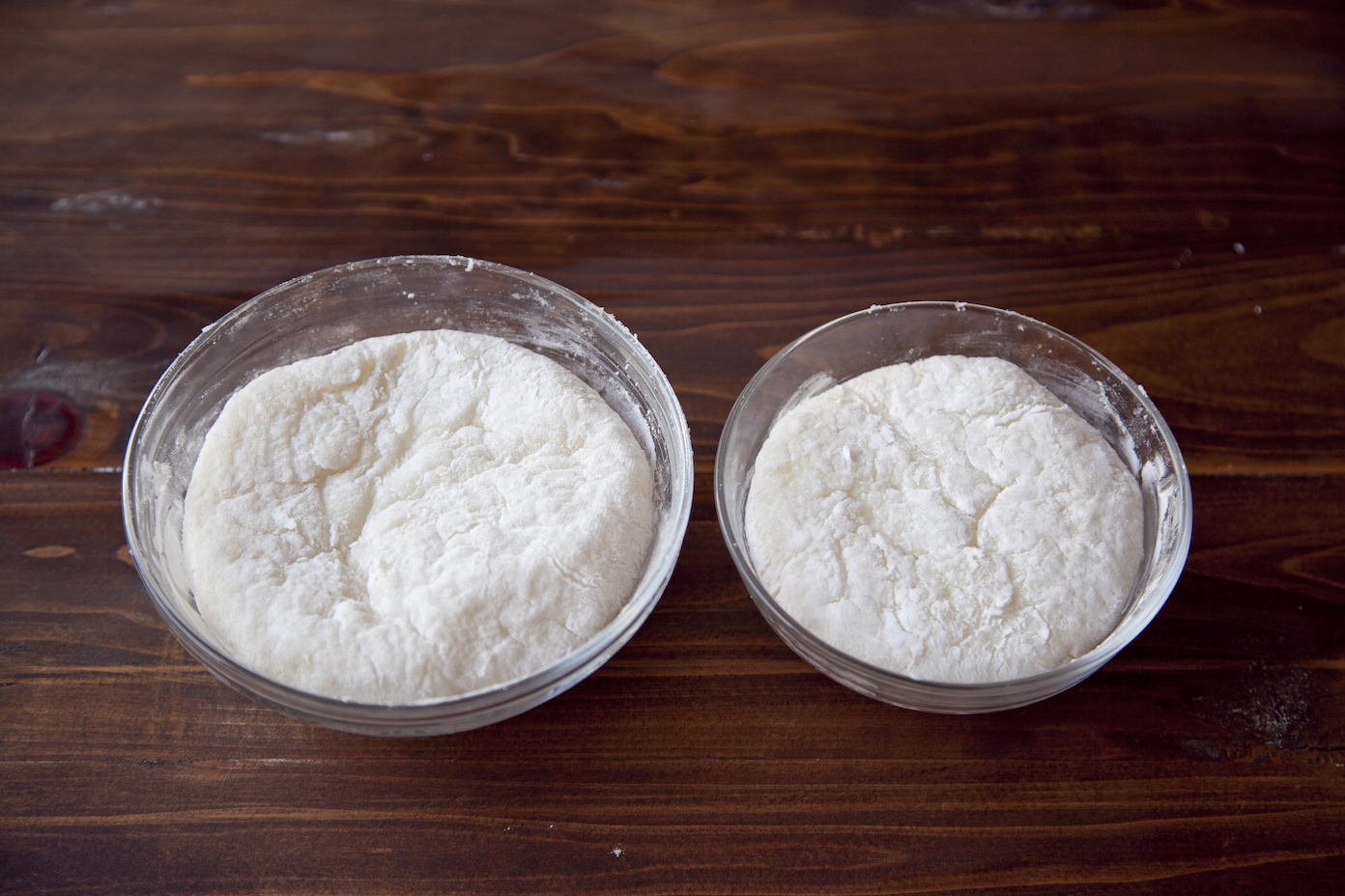 大小の器に片栗粉を広げて、それぞれもちを入れてそのまま冷ます。