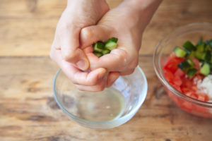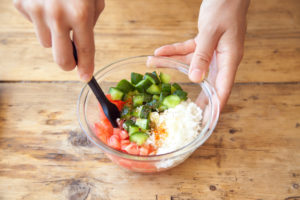 きゅうりは1cmの角切りにし、塩少々(分量外) を揉み込み5分おき、水気を絞る。