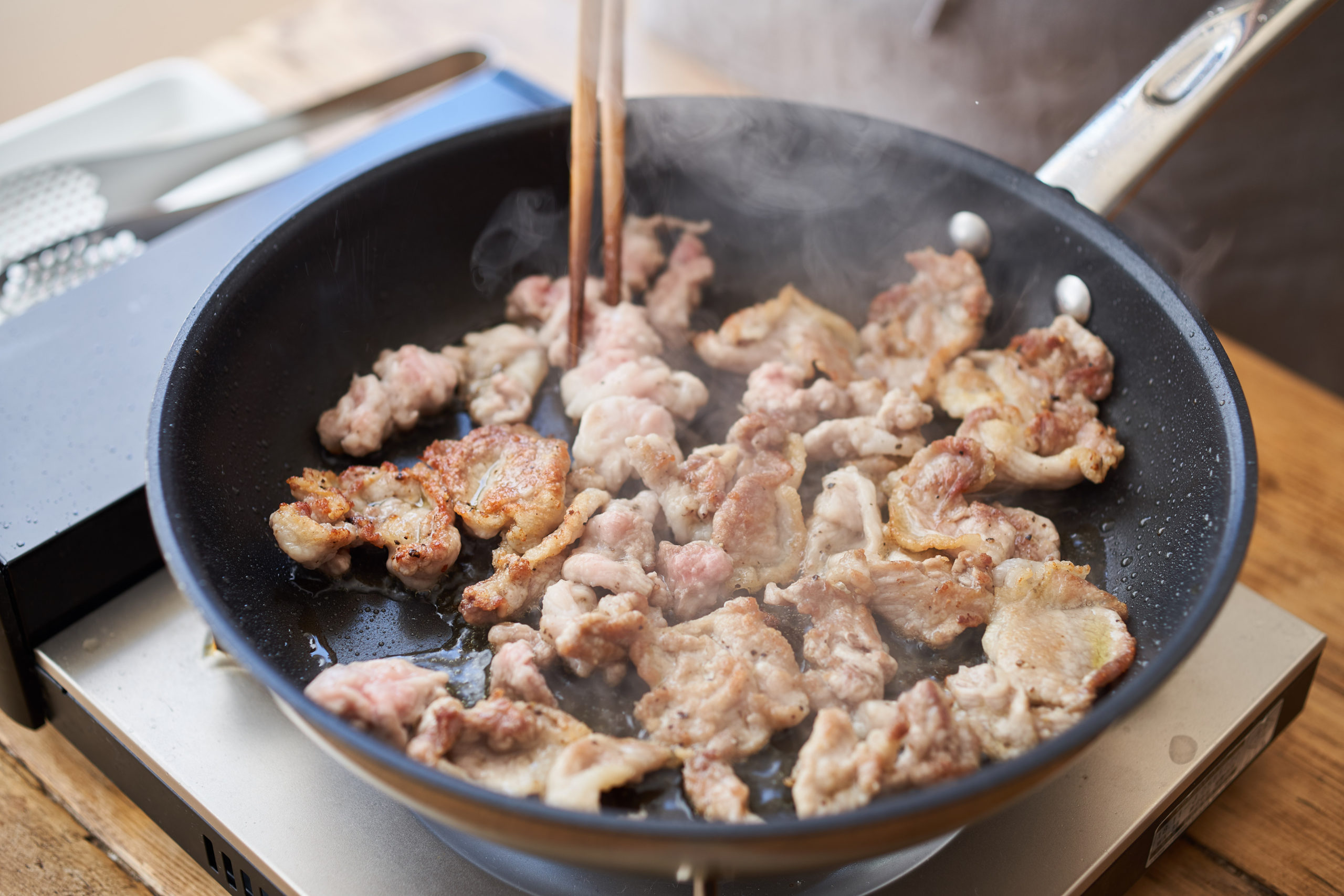 あまり触らず、両面焼き色がつき、カリッとしたら器に盛る。