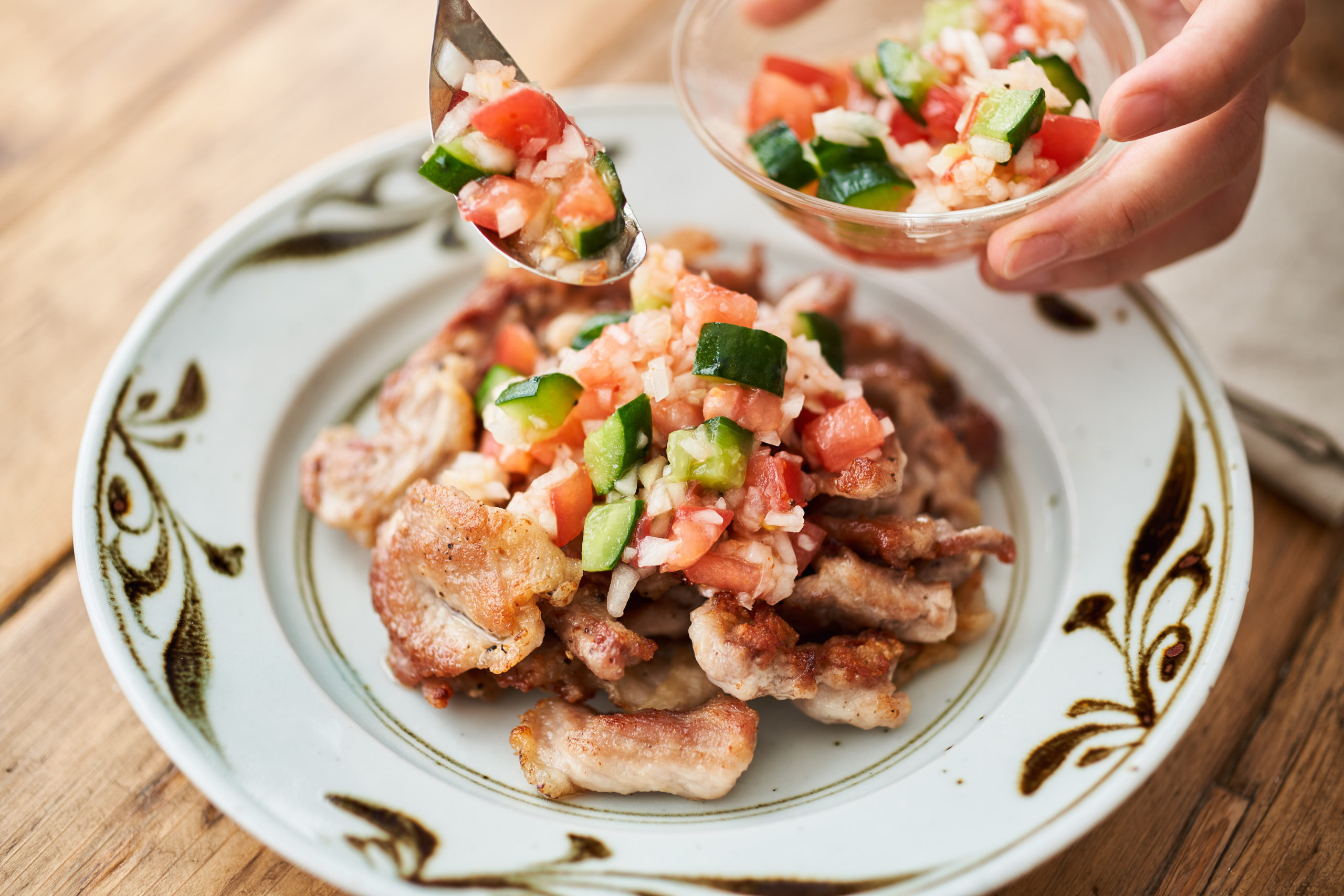 カリッと仕上げた豚肉に、野菜たっぷりサルサソースを。