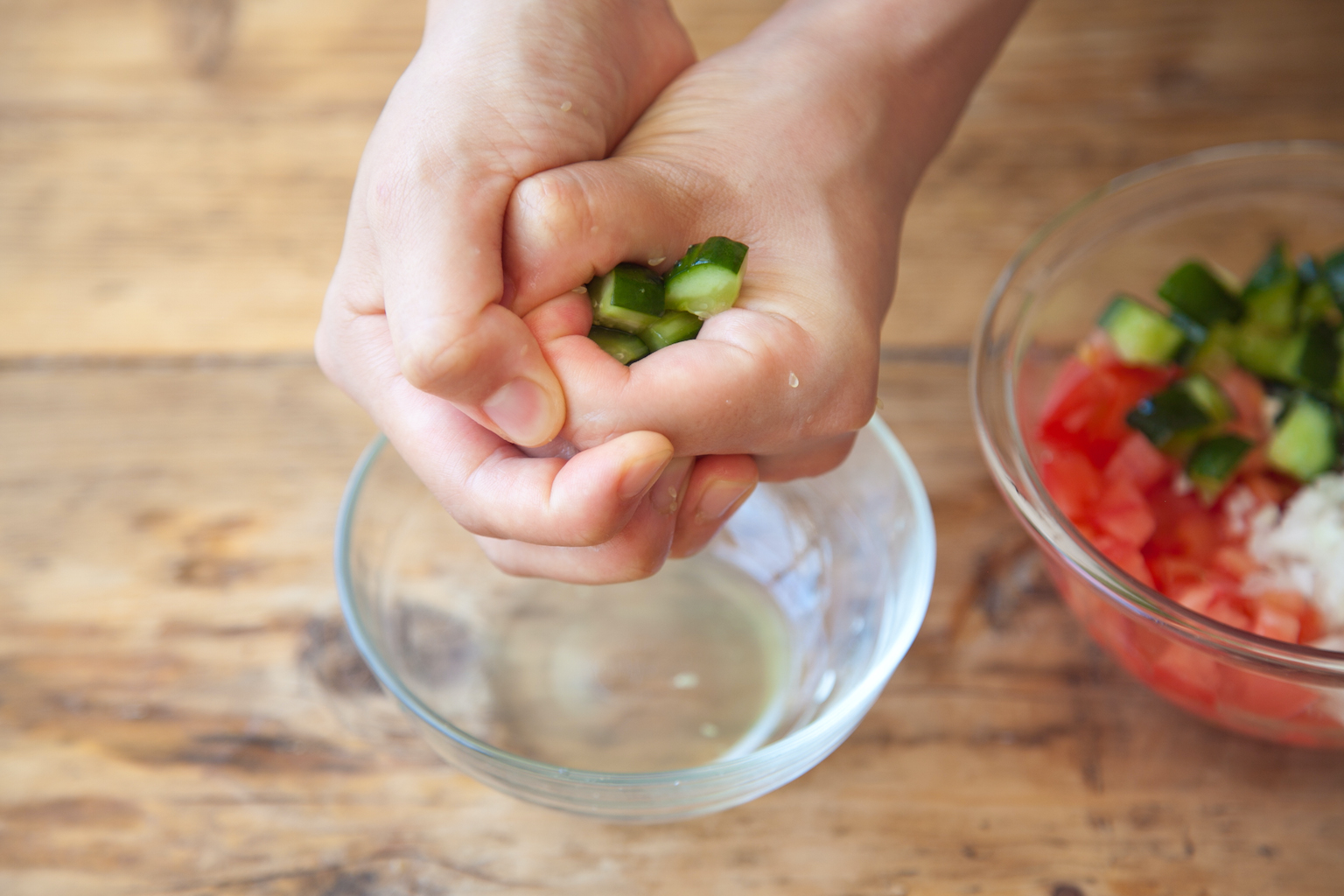 きゅうりは1cmの角切りにし、塩少々(分量外) を揉み込み5分おき、水気を絞る。