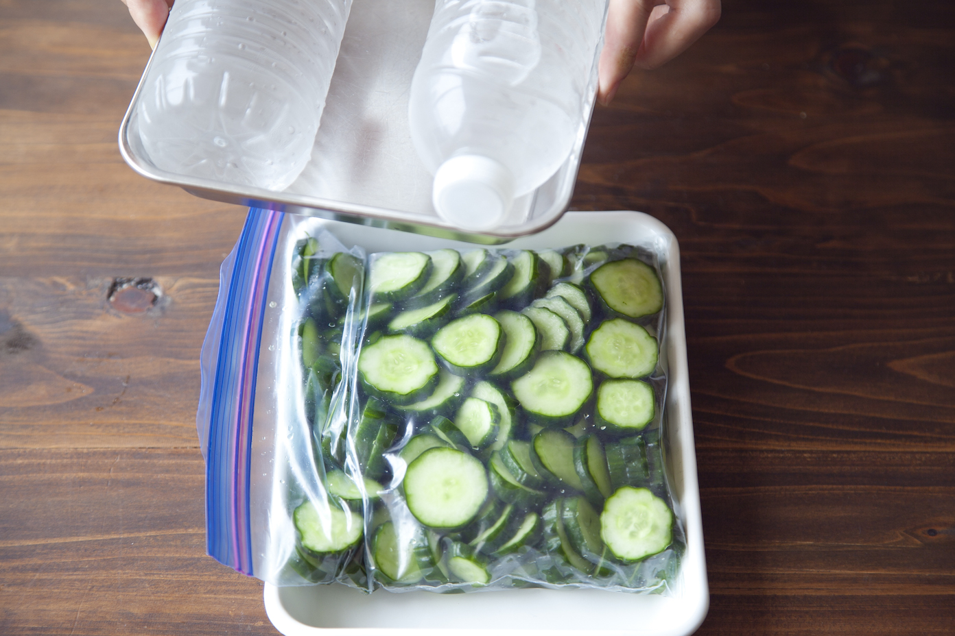 1kgの重石( 500mlのペットボトル2本など)をのせ冷蔵庫に1時間〜一晩おく。