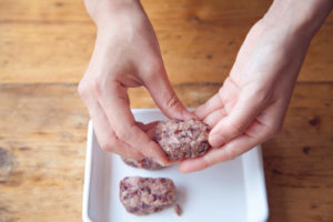 水で濡らした包丁で4等分に切り、手を水で濡らしながら一切れずつ丸めて楕円形にのばし、