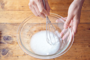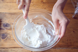一度取り出して混ぜてさらに1分加熱、一度取り出して混ぜてさらに40秒加熱し、混ぜる。