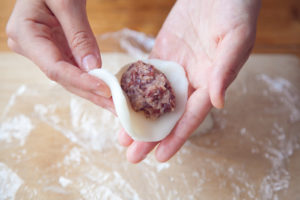 1のあんをのせて半分に折る。冷めたら柏の葉に包む。