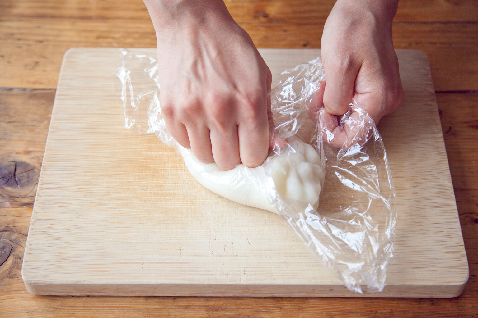水で濡らした包丁で4等分に切り、手を水で濡らしながら一切れずつ丸めて楕円形にのばし、