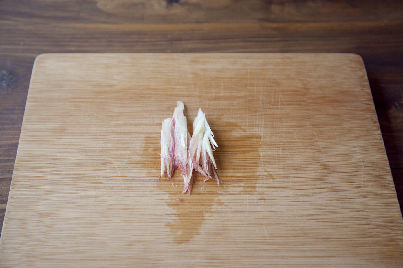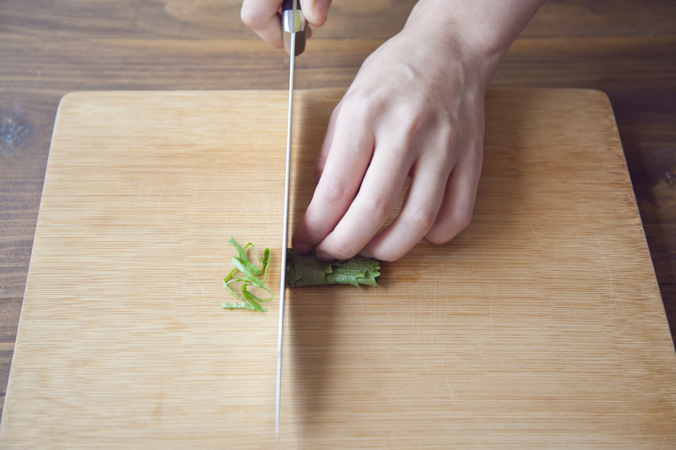 【1】大葉、みょうがは千切りにする。しょうがは皮をむき、すりおろす。