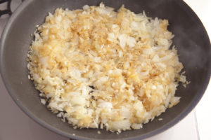 玉ねぎ、しょうゆ、塩を加えて焼き色がつくまで炒める。