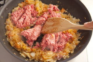 トマトを加えて潰すようにペースト状になるまで炒める。合挽き肉を加える。