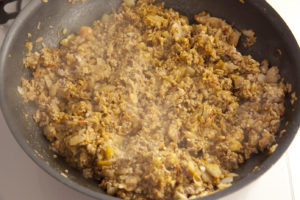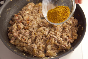 合挽き肉の色が変わったら、カレー粉を加え、粉っぽさがなくなったらジャムを加える。