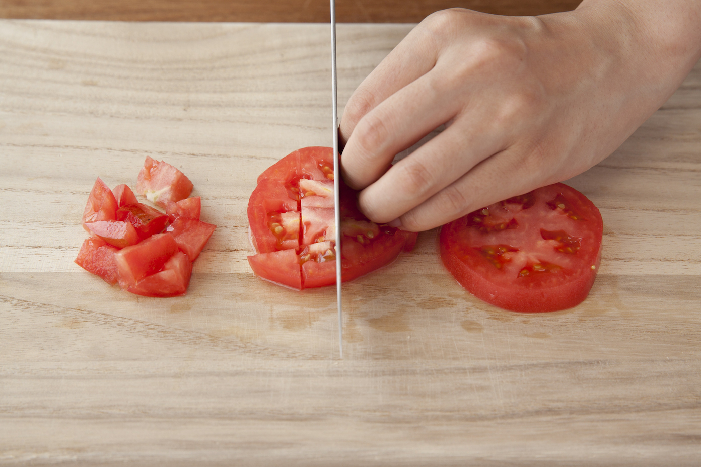 トマトは角切り、玉ねぎ、にんにく、しょうがはみじん切りにする。