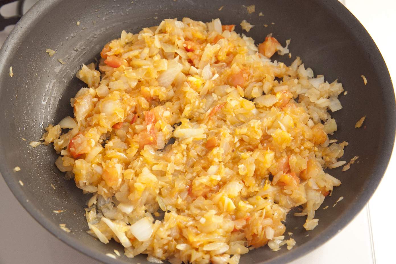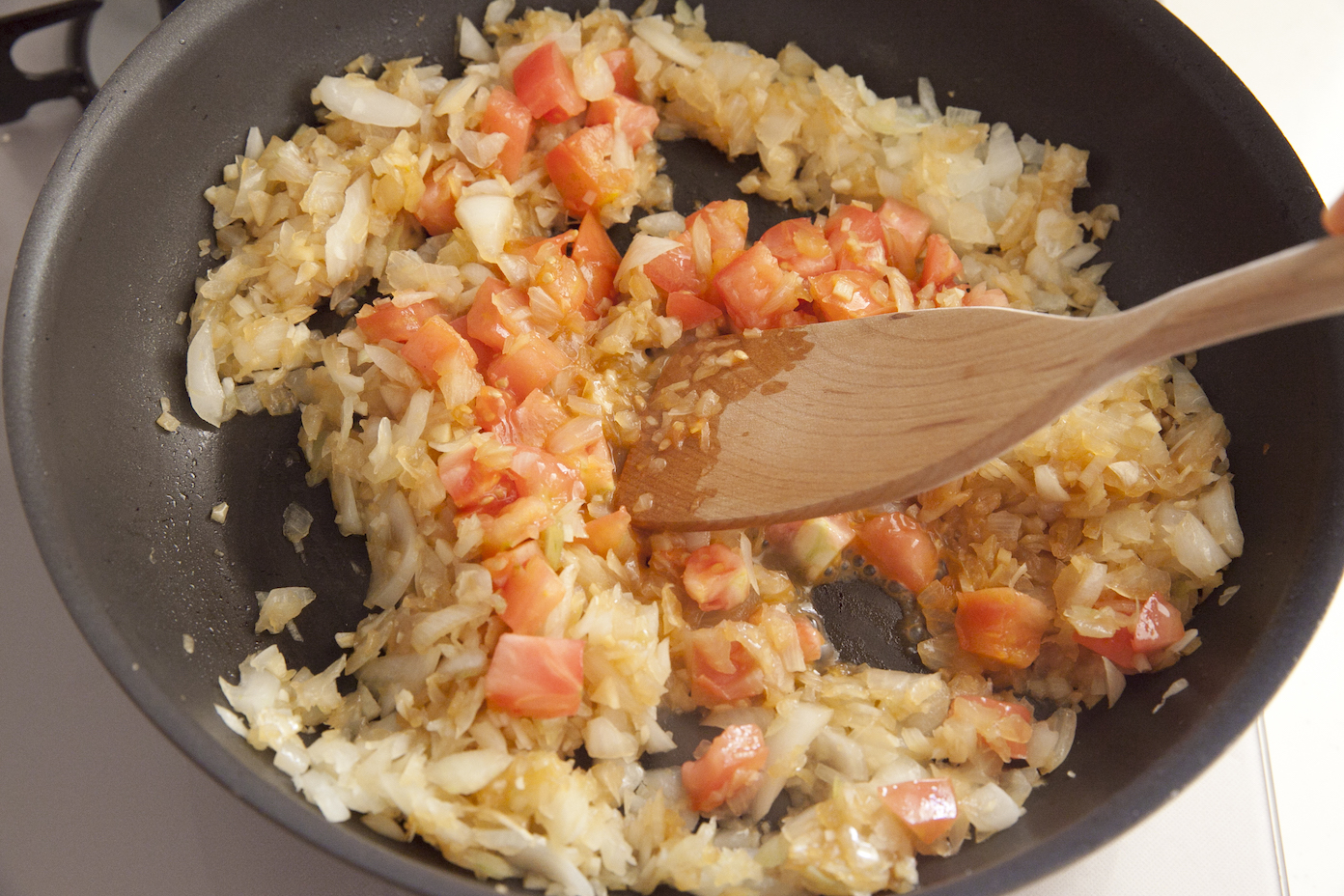 トマトを加えて潰すようにペースト状になるまで炒める。合挽き肉を加える。