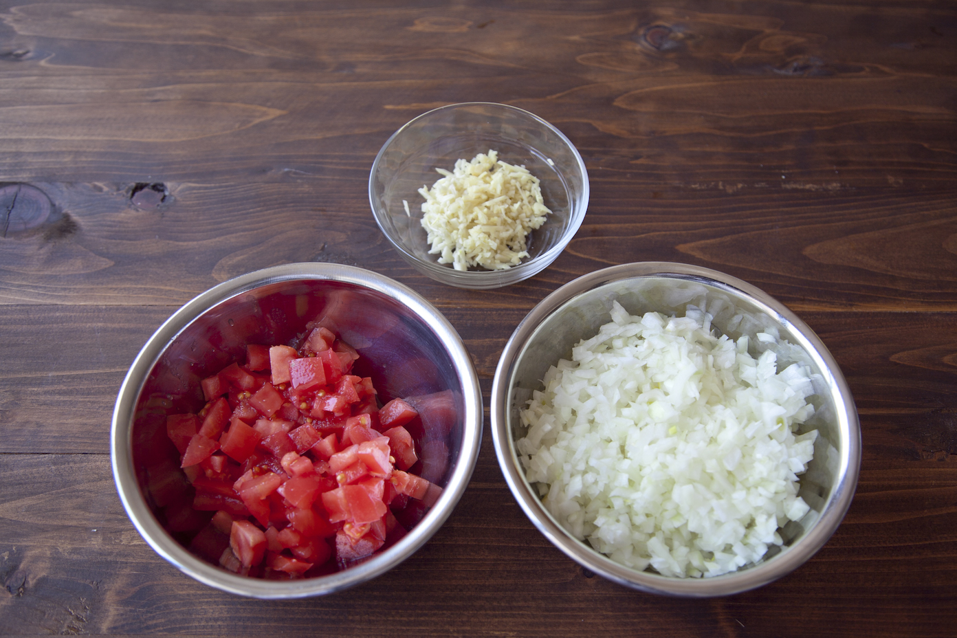 玉ねぎ、にんにく、しょうがをみじん切り、トマトを角切りにする。