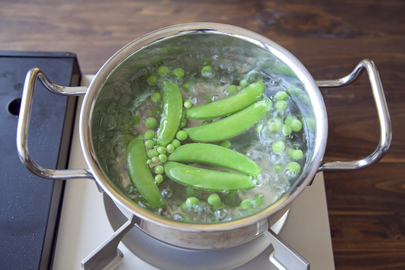 鍋に湯をわかし、塩少々(分量外)を加えてスナップエンドウ、グリーンピースを2分ほど茹で、ざるに上げておく。