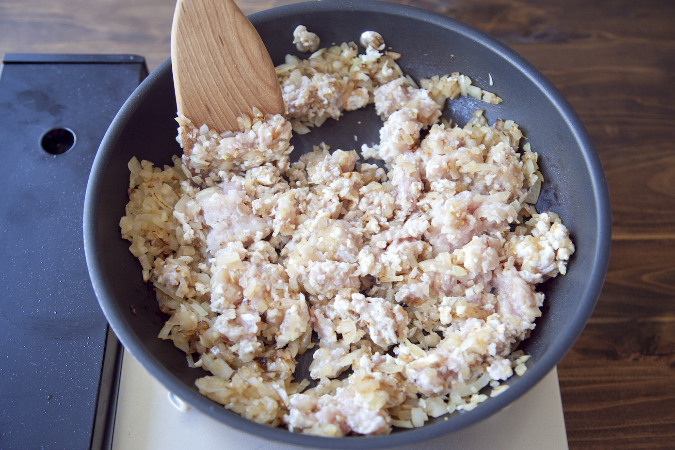 最初は触らず焼き色をつけるようにして、しんなりするまで炒め、にんにく、しょうが、鶏挽肉を加え炒める。