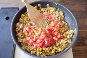 トマト、トマトケチャップ、しょうゆを加え、トマトを潰すように炒める。