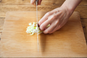 にんにくは半分、しょうがは薄切り、長ねぎはみじん切りにする。