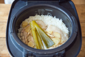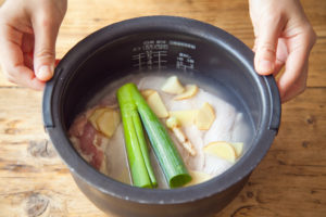鶏肉を塩麹ごと、しょうが、にんにく、あれば長ねぎの青い部分、