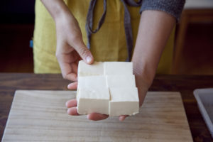 絹ごし豆腐は6等分に切る。豚バラ肉は半分の長さに切る。