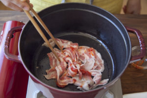 鍋(炒め調理ができるもの)に、ごま油を中火で熱し豚肉、豆板醤を炒める。