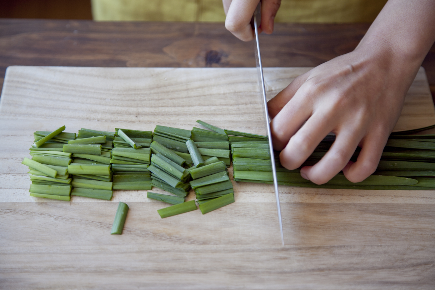 ニラは3cmの長さに切る。えのきたけは根元を切り取り、手でほぐす。