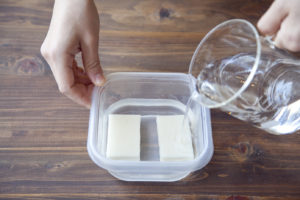 切り餅を耐熱皿に離していれ、かぶる程度まで水を注いで電子レンジ600Wで2分程度、もちが柔らかくなるまで加熱する。